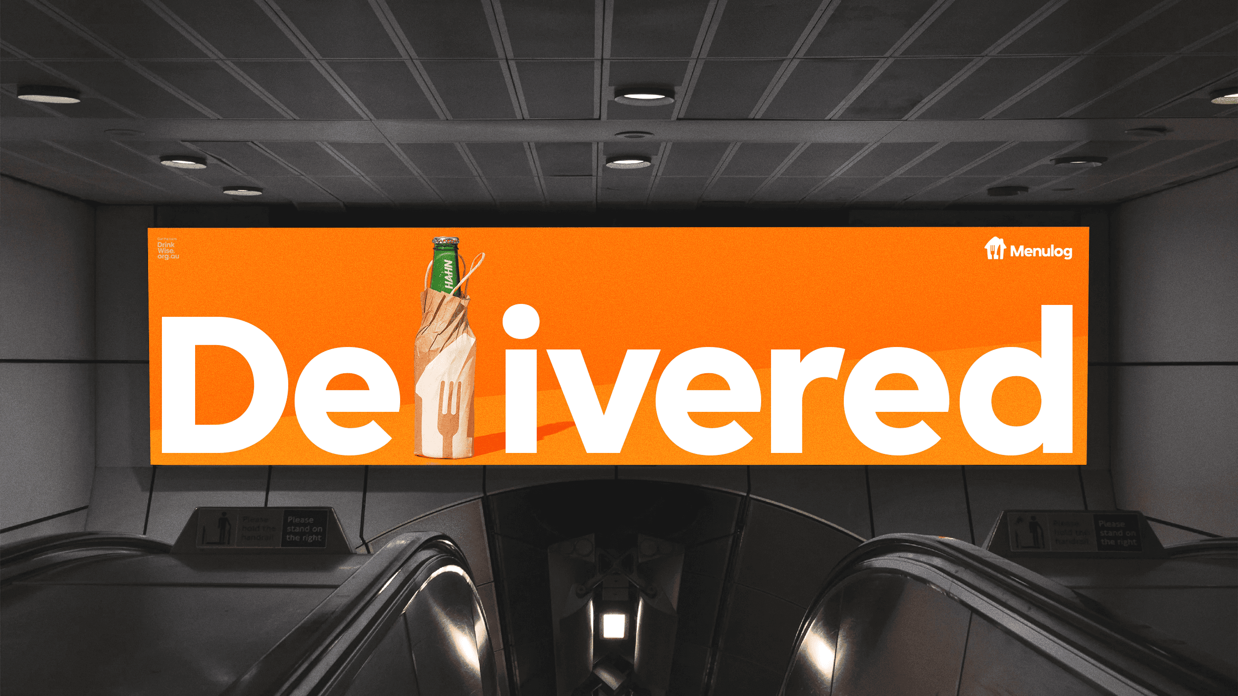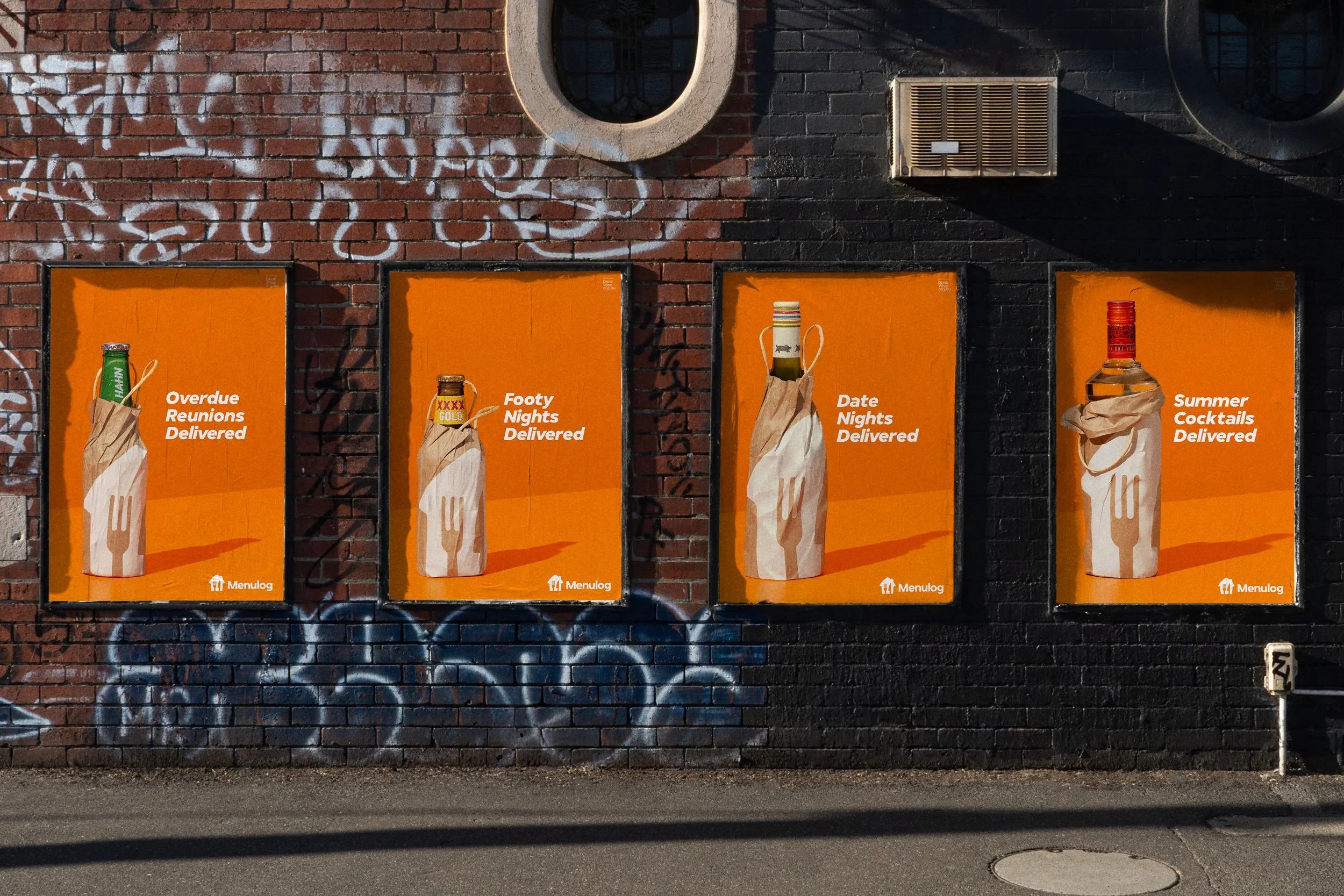Für den Sommer hat Lieferando seinen neuen Alkohol-Lieferservice gestartet, und wir wollten, dass er clever wirkt und gleichzeitig zur Marke passt. Wir haben eines ihrer bekanntesten Assets, die Menulog-Liefertasche, genommen und mit der Idee der braunen Papiertüten kombiniert, die Flaschenläden benutzen, um Flaschen zu verpacken – die, die man auch benutzt, um heimlich in der Öffentlichkeit zu trinken und es zu verstecken, was in Australien im Gegensatz zu Deutschland verboten ist, wer hat das nicht schon mal gemacht? Das hat Spaß gemacht. Für die Kampagnen-Visuals haben wir verschiedene Alkoholflaschen in der Menulog-Papiertüte fotografiert, auf dem typischen orangenen Hintergrund von Menulog, um die Idee auf eine klare, einfache und sofort erkennbare Weise zum Leben zu bringen.